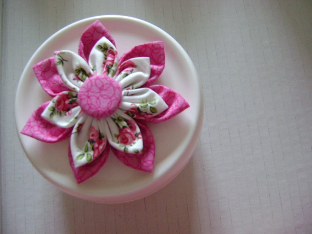 Ursprünglich wurden diese Blumen in Japan als Haarschmuck hergestellt. Für mich war es eine wunderschöne Gelegenheit, Stoffreste zu verarbeiten und auf leere Nivea-Dosen zu kleben.